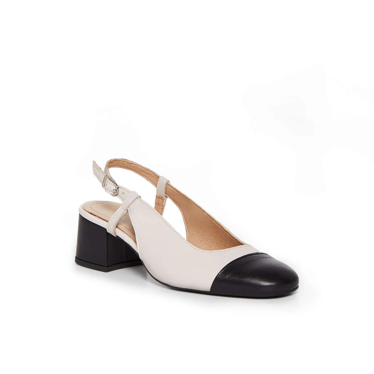 Affirmez votre élégance avec le modèle BRUNIE en version bicolore beige et noir, une sandale slingback raffinée qui conjugue charme vintage et modernité. Confectionnée en cuir de chèvre souple, elle se distingue par son contraste subtil entre l’empeigne beige lumineuse et le bout noir profond qui structure la silhouette. Montée sur un petit talon carré confortable, elle incarne l’allure féminine et intemporelle idéale pour vos tenues de bureau comme pour les occasions plus habillées. Fabriquée avec soin au Portugal, elle séduit par sa finesse et son confort.
